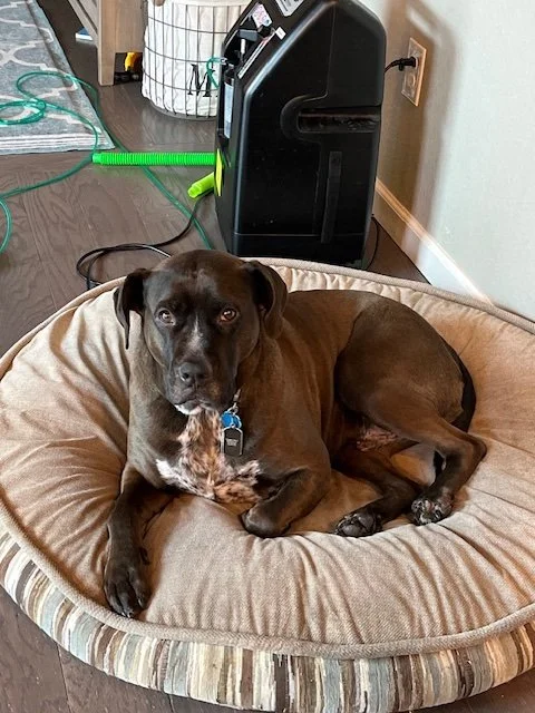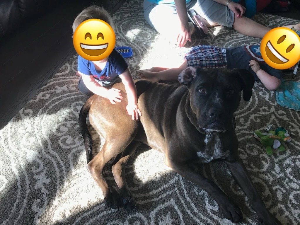 Marlin is a 7 year old male pit bull lab mix that loves to nap, go on walks, play with his human siblings, and destroy toys. He loves to relax by sneaking upstairs and laying on the couch, being alone, getting belly rubs, laying in the sun, and being outside. He can sit, stay, go to his bed, roll over and give high fives.